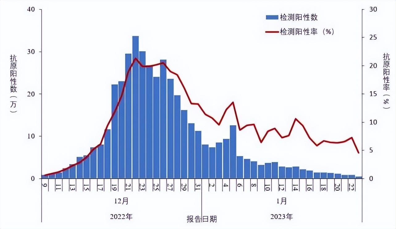 图 1-2 全国报告人群新型冠状病毒抗原检测阳性数及阳性率变化趋势(数据来源于31个省(区、市)及新疆生产建设兵团报告)